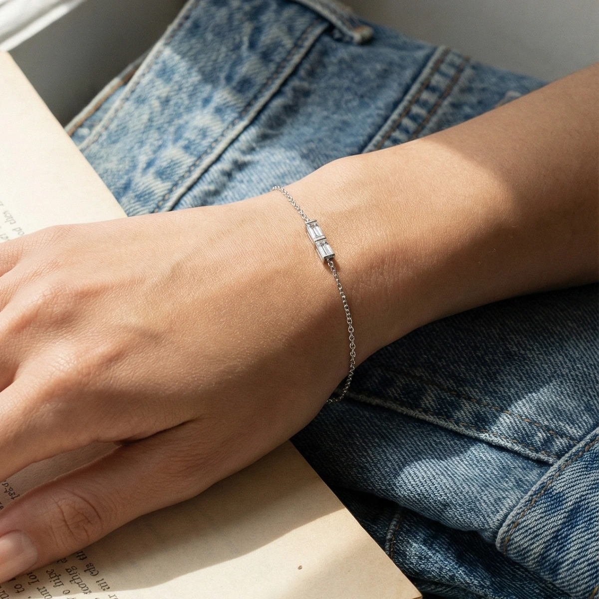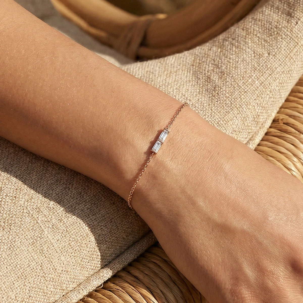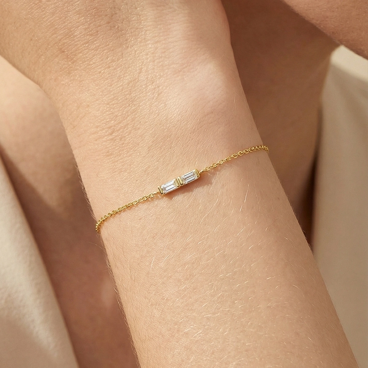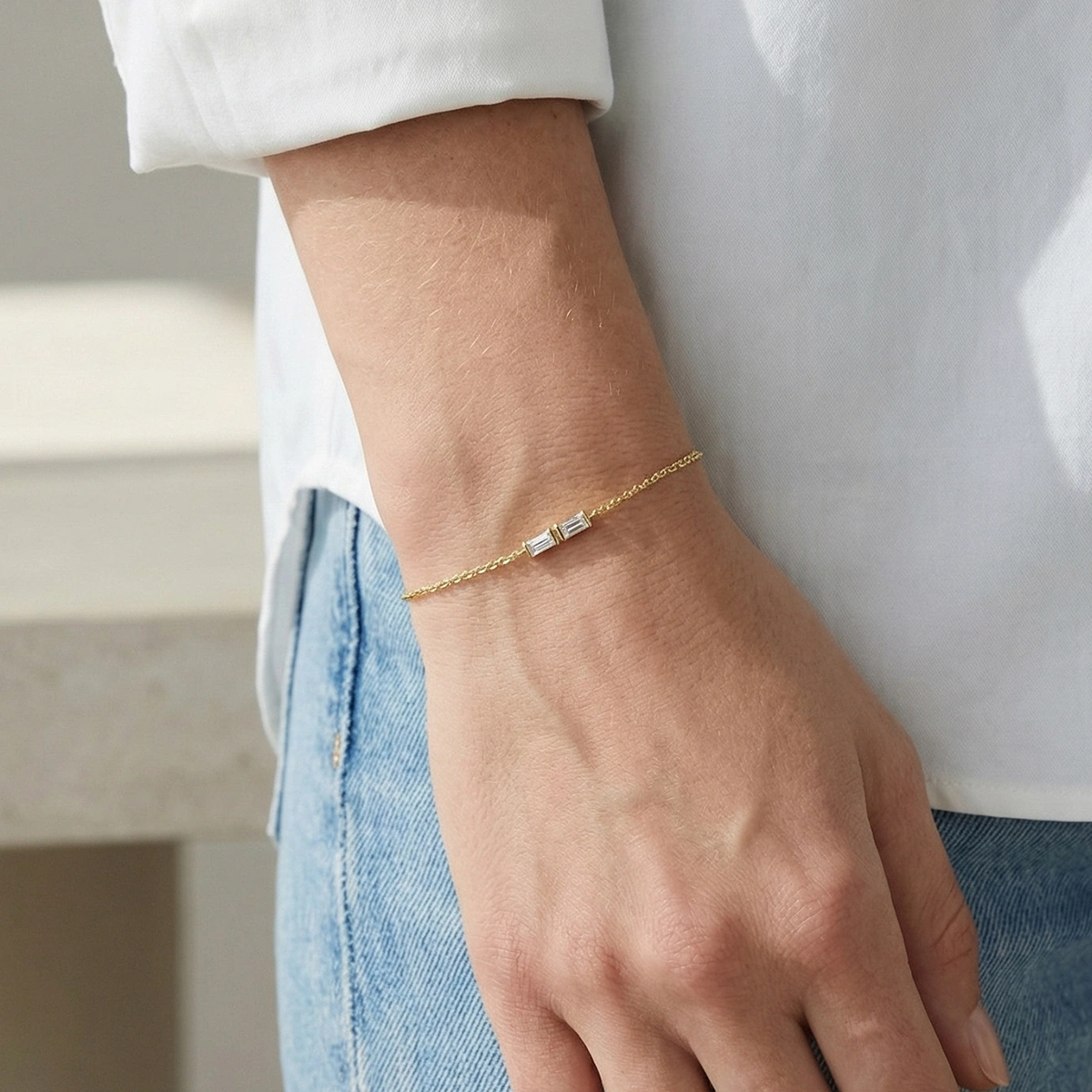 Parlak baget taşların sahne aldığı bu bileklik, sade ama etkileyici çizgisiyle öne çıkar. Diğer takılarla kombinlenebilir olması sayesinde farklı stillerde zarafet yaratmanıza yardımcı olur. Yüksek kaliteli işçilik ile üretilmiş bu bileklik, uzun süreli kullanıma uygundur ve tarzınıza değer katar.