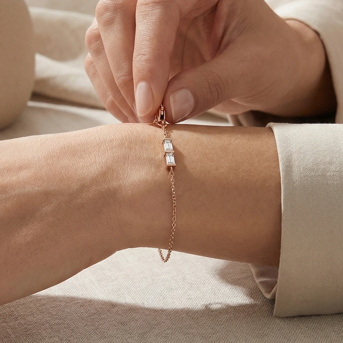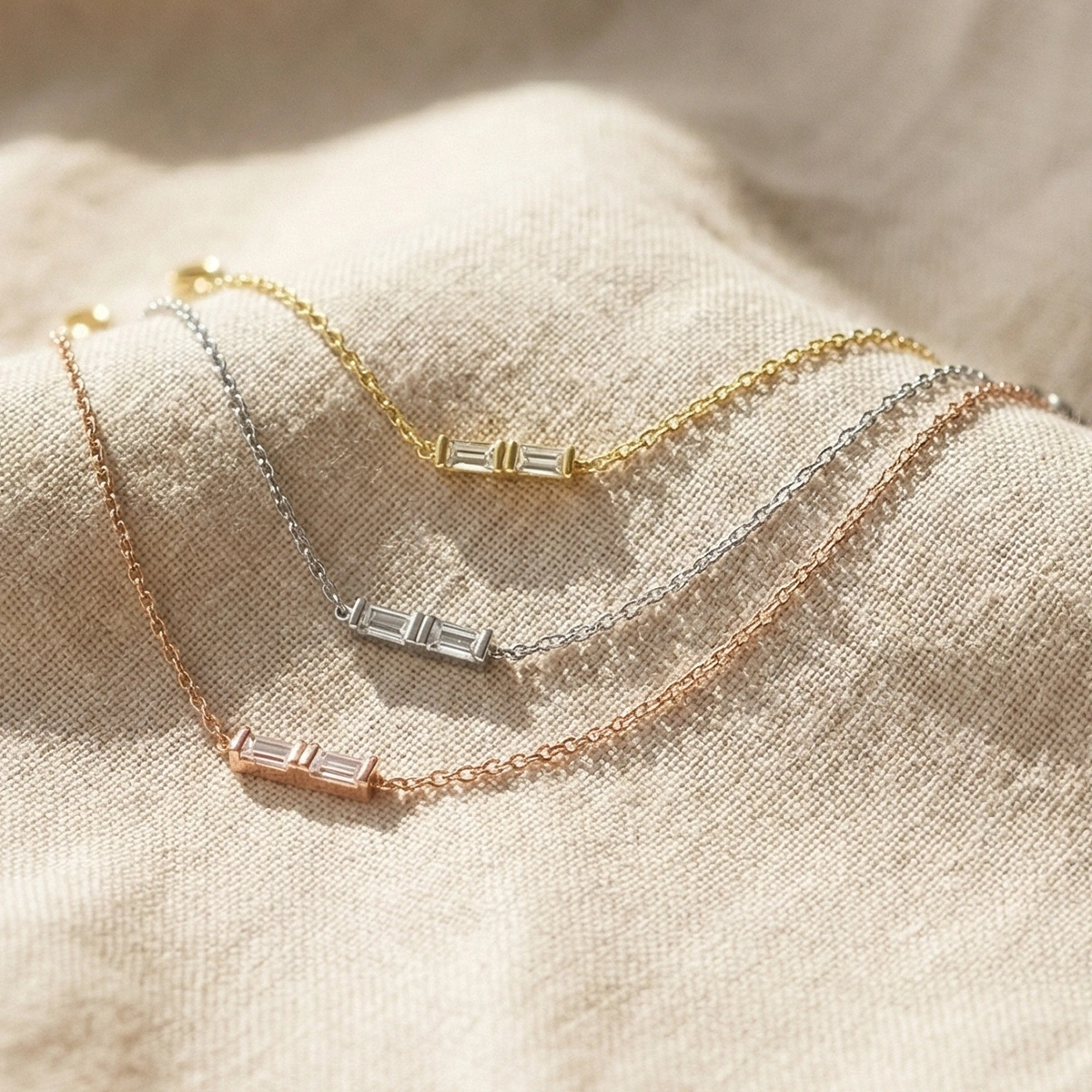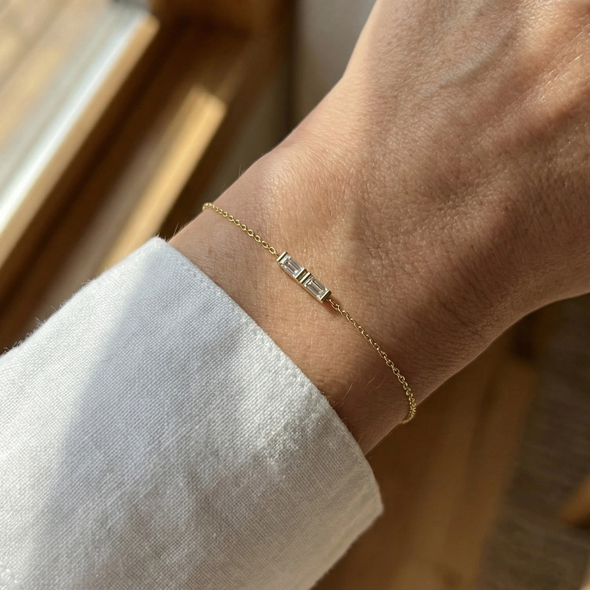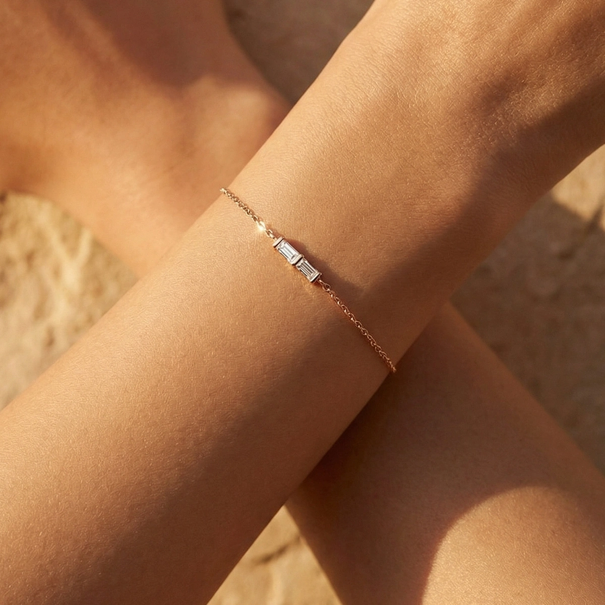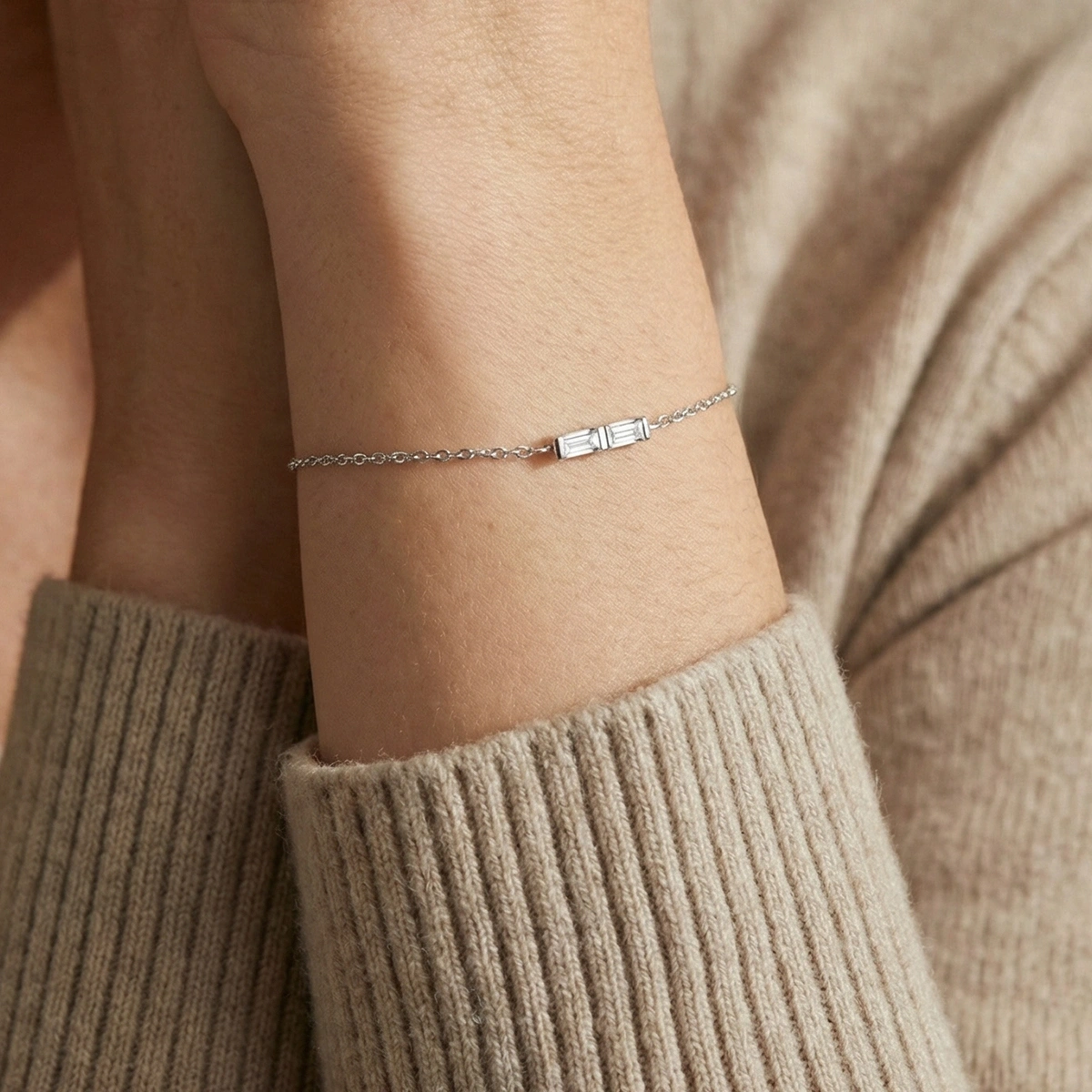 Parlak baget taşların sahne aldığı bu bileklik, sade ama etkileyici çizgisiyle öne çıkar. Diğer takılarla kombinlenebilir olması sayesinde farklı stillerde zarafet yaratmanıza yardımcı olur. Yüksek kaliteli işçilik ile üretilmiş bu bileklik, uzun süreli kullanıma uygundur ve tarzınıza değer katar.