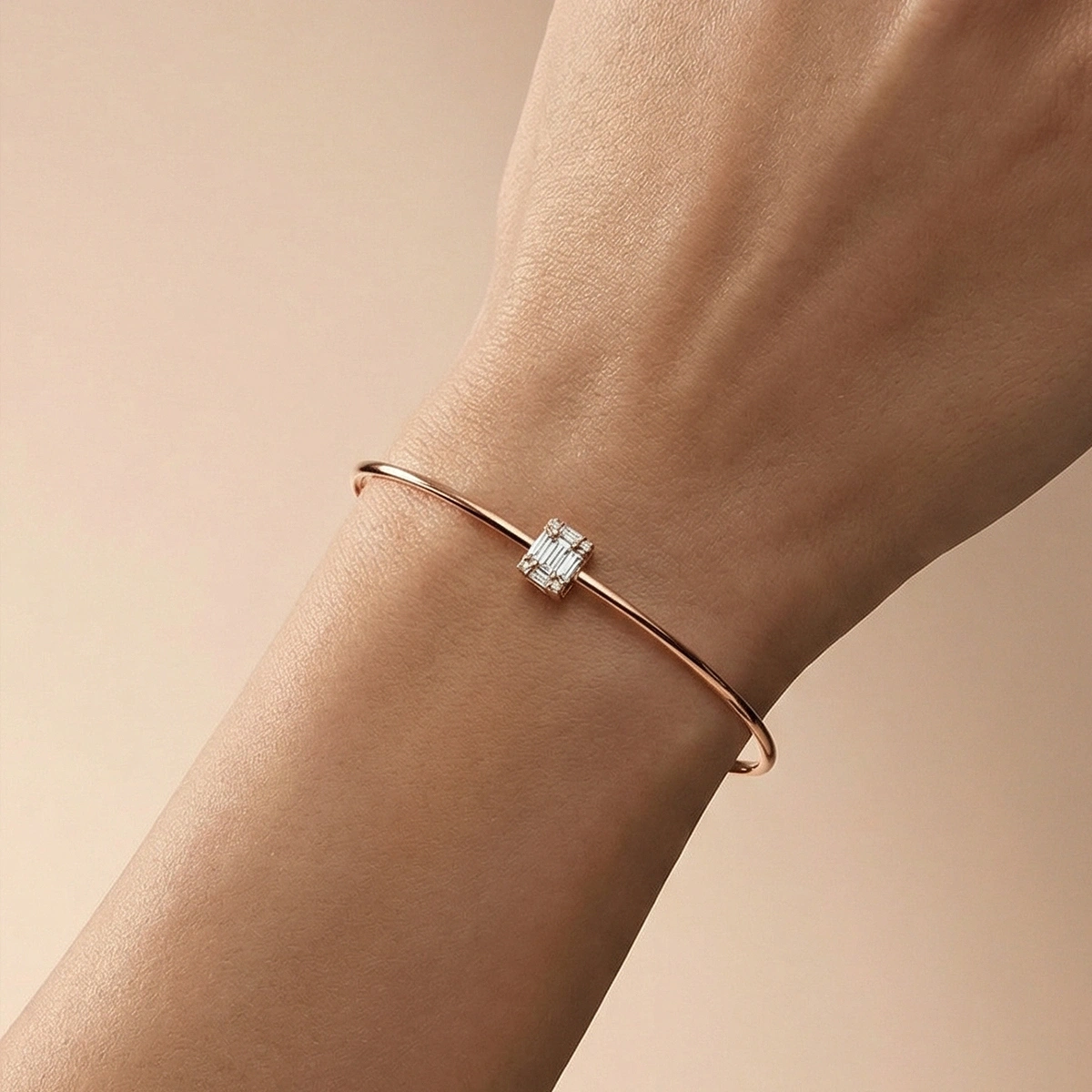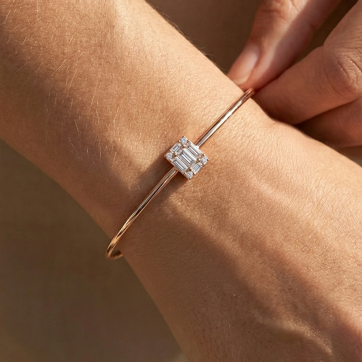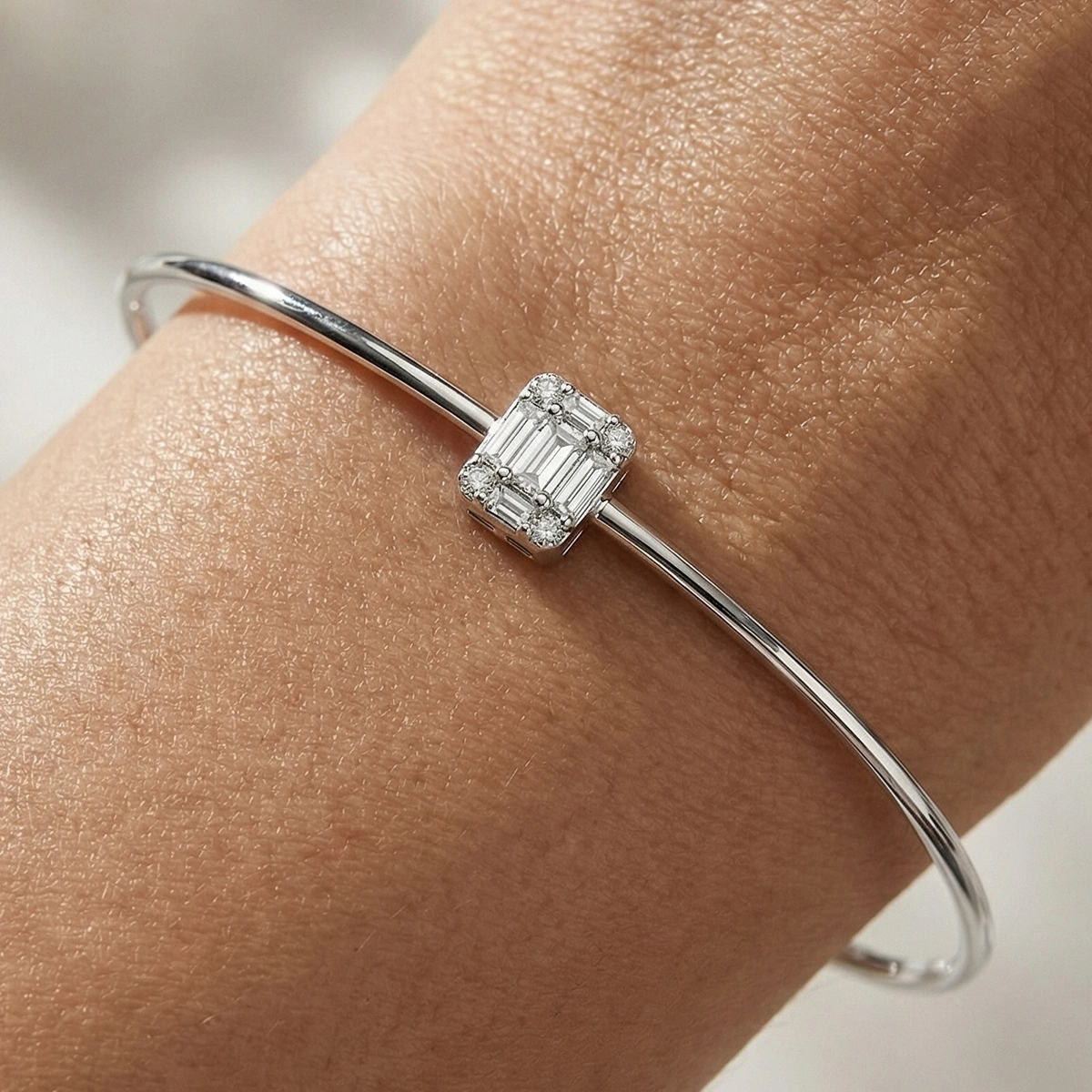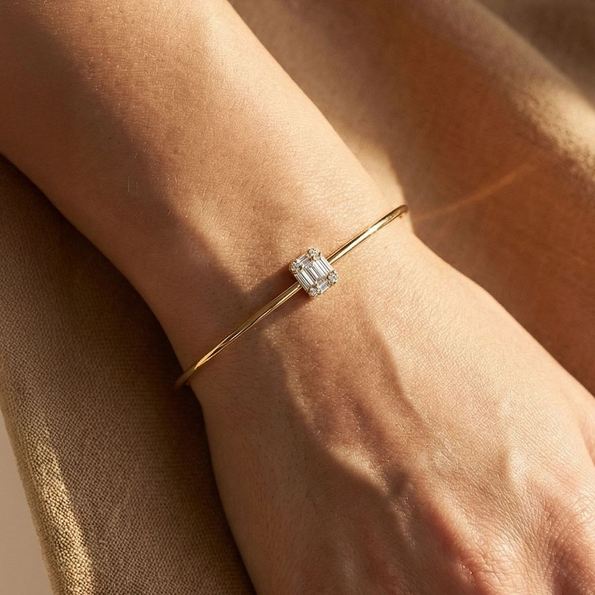Baget taşların estetik uyumu ile modern çizgileri bir araya getiren bu bileklik, sade ama etkileyici detaylarla stilinizi tamamlar. Kaliteli işçiliği sayesinde uzun süreli kullanım için tasarlanmış olup, diğer takılarla kombinlendiğinde de zarif bir bütünlük oluşturur.
