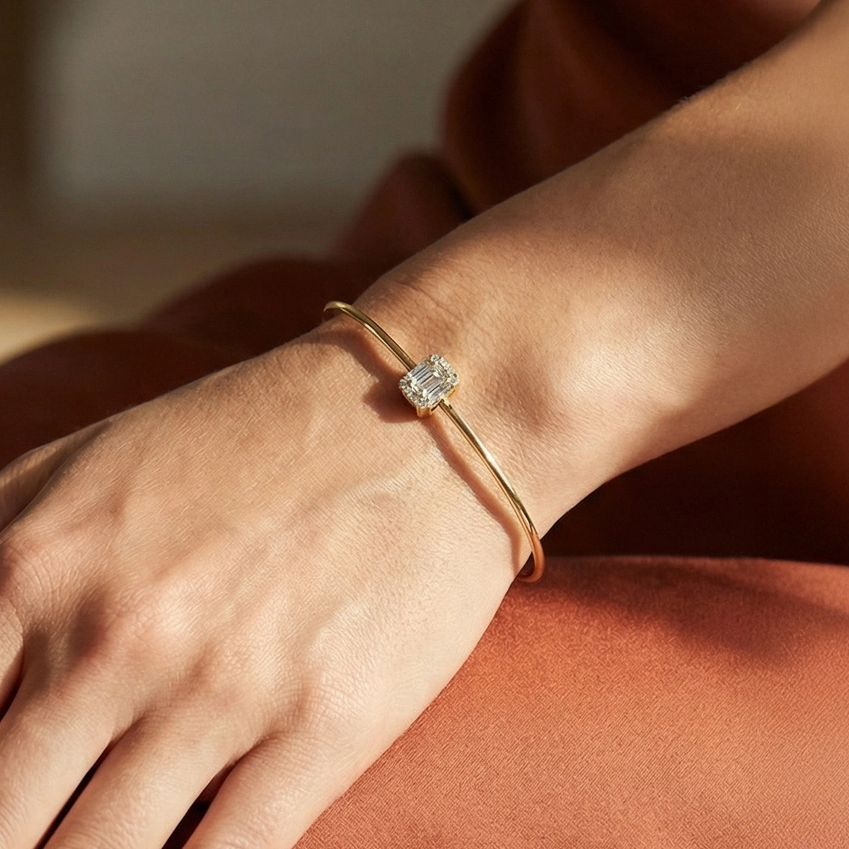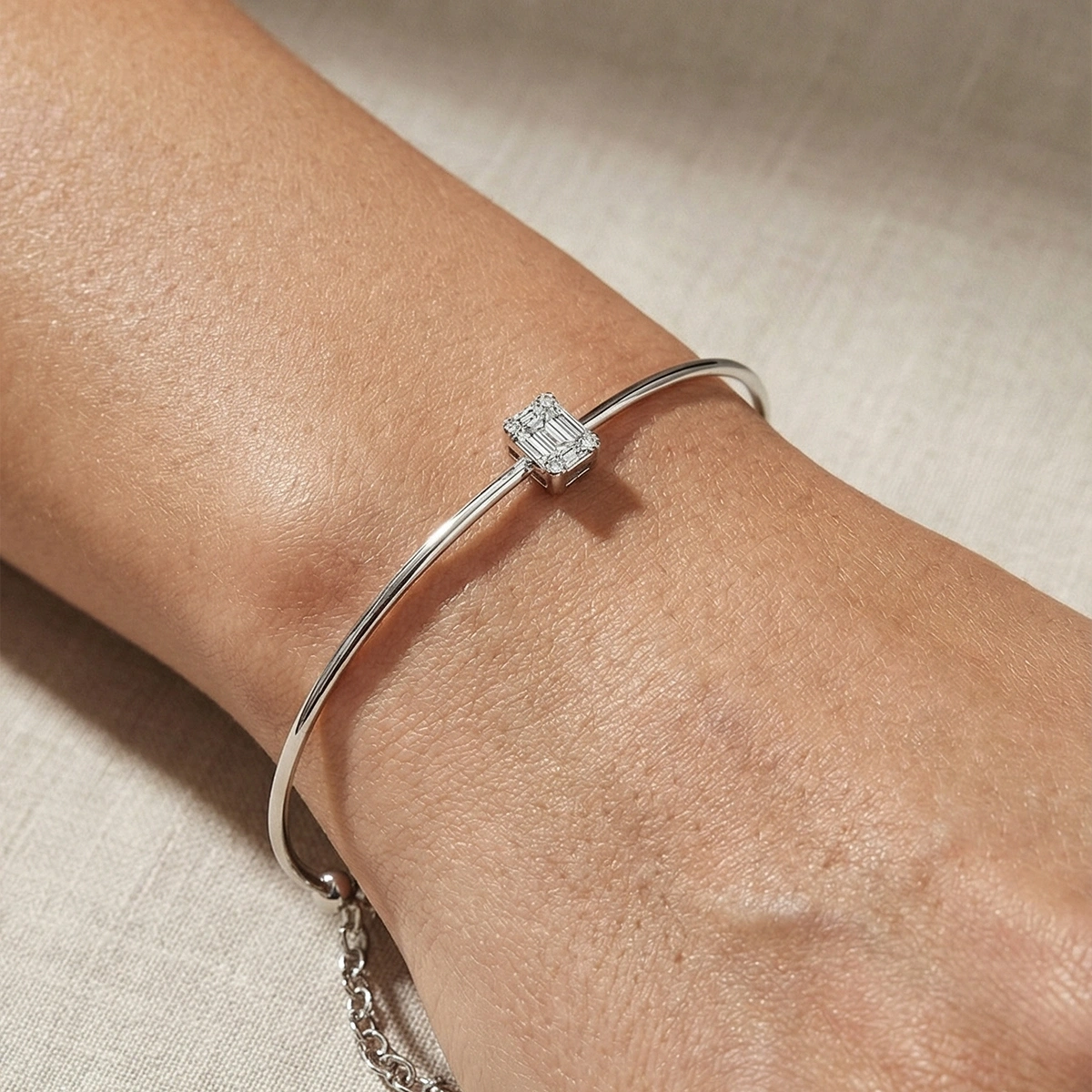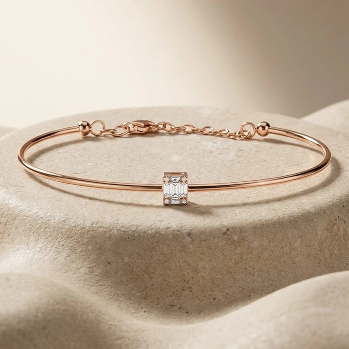 Baget taşların estetik uyumu ile modern çizgileri bir araya getiren bu bileklik, sade ama etkileyici detaylarla stilinizi tamamlar. Kaliteli işçiliği sayesinde uzun süreli kullanım için tasarlanmış olup, diğer takılarla kombinlendiğinde de zarif bir bütünlük oluşturur.