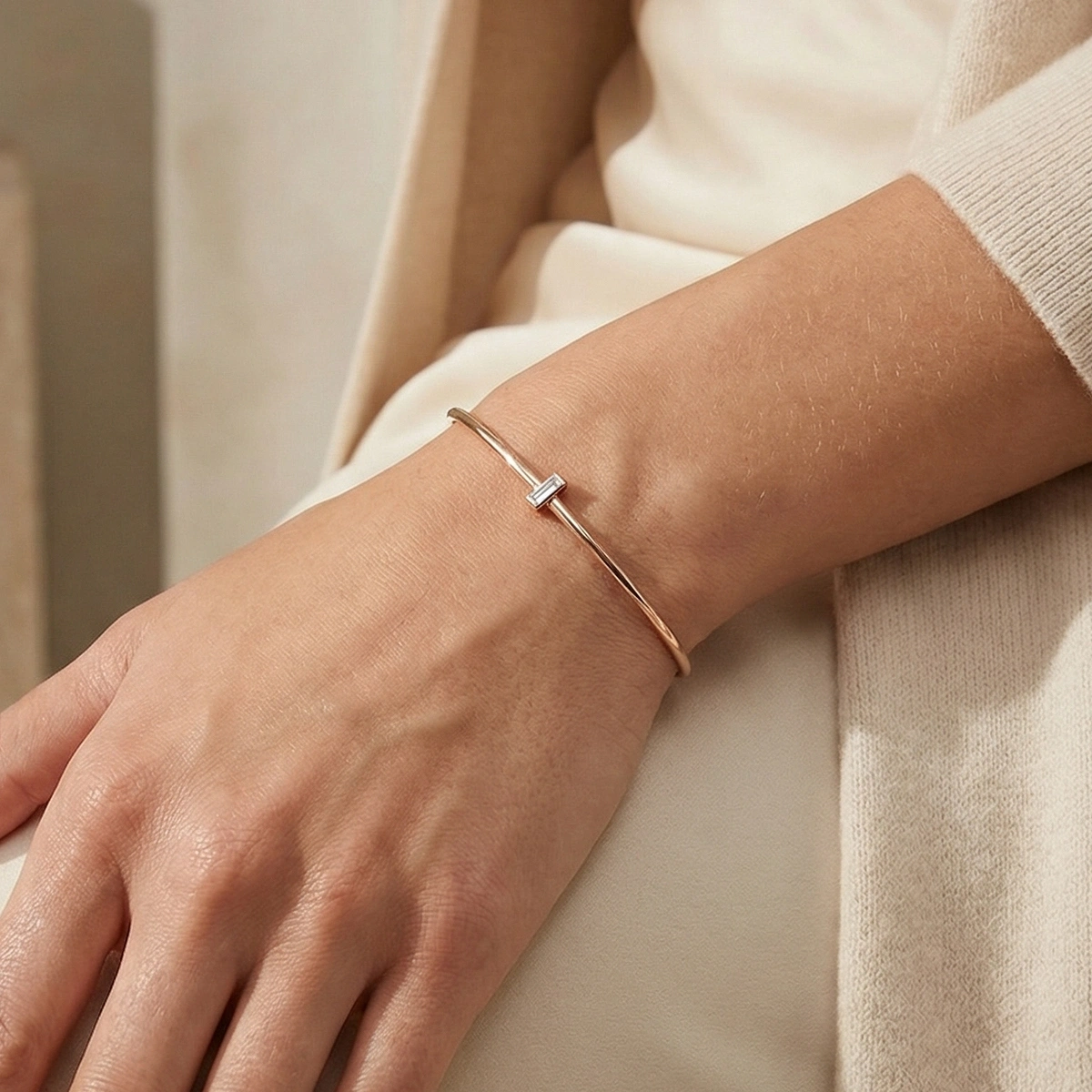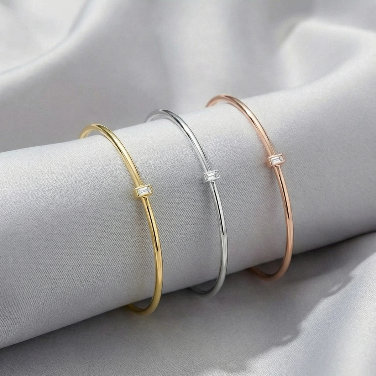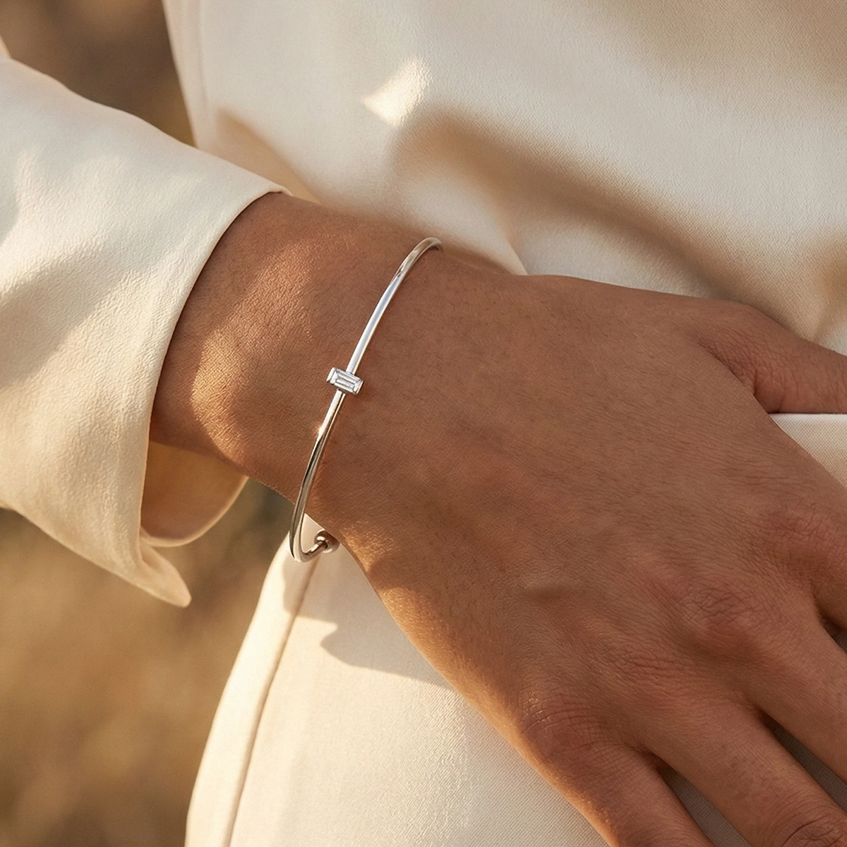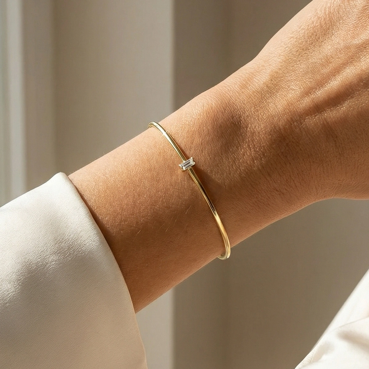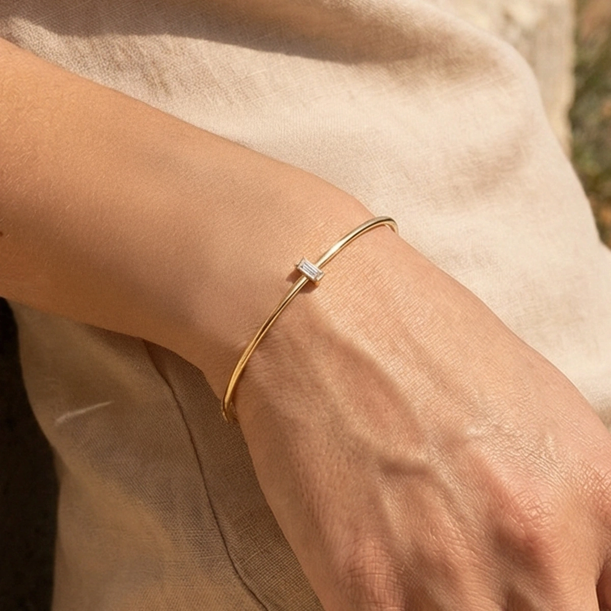Baget kesim tek taşın zarif çizgileriyle tasarlanan bu bileklik, diğer takılarla kolayca kombinlenebilir. Modern ve şık duruşuyla farklı tarzlara uyum sağlar. Kaliteli işçilik ile uzun süre dayanacak şekilde üretilmiş olup her anınıza estetik bir görünüm ekler.
