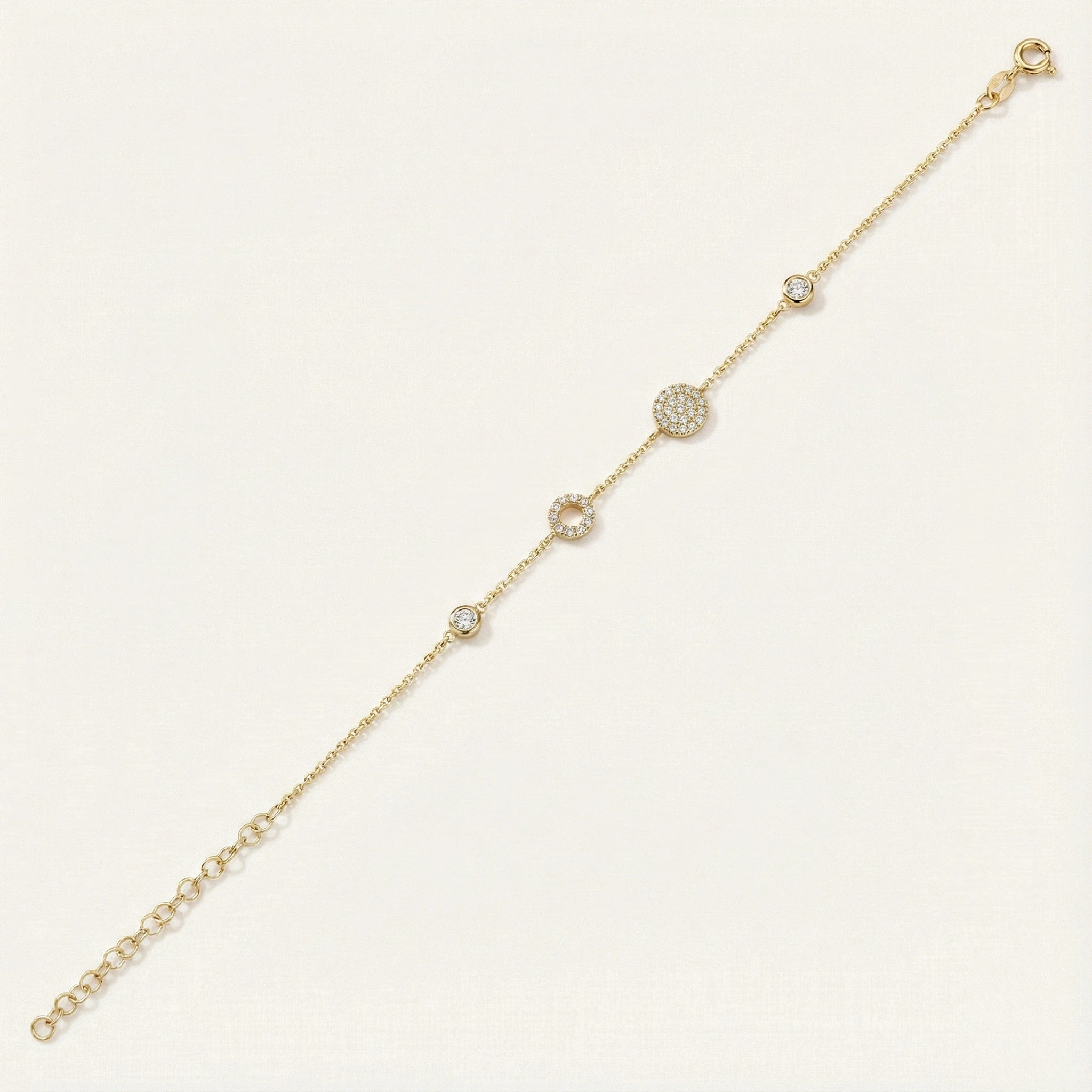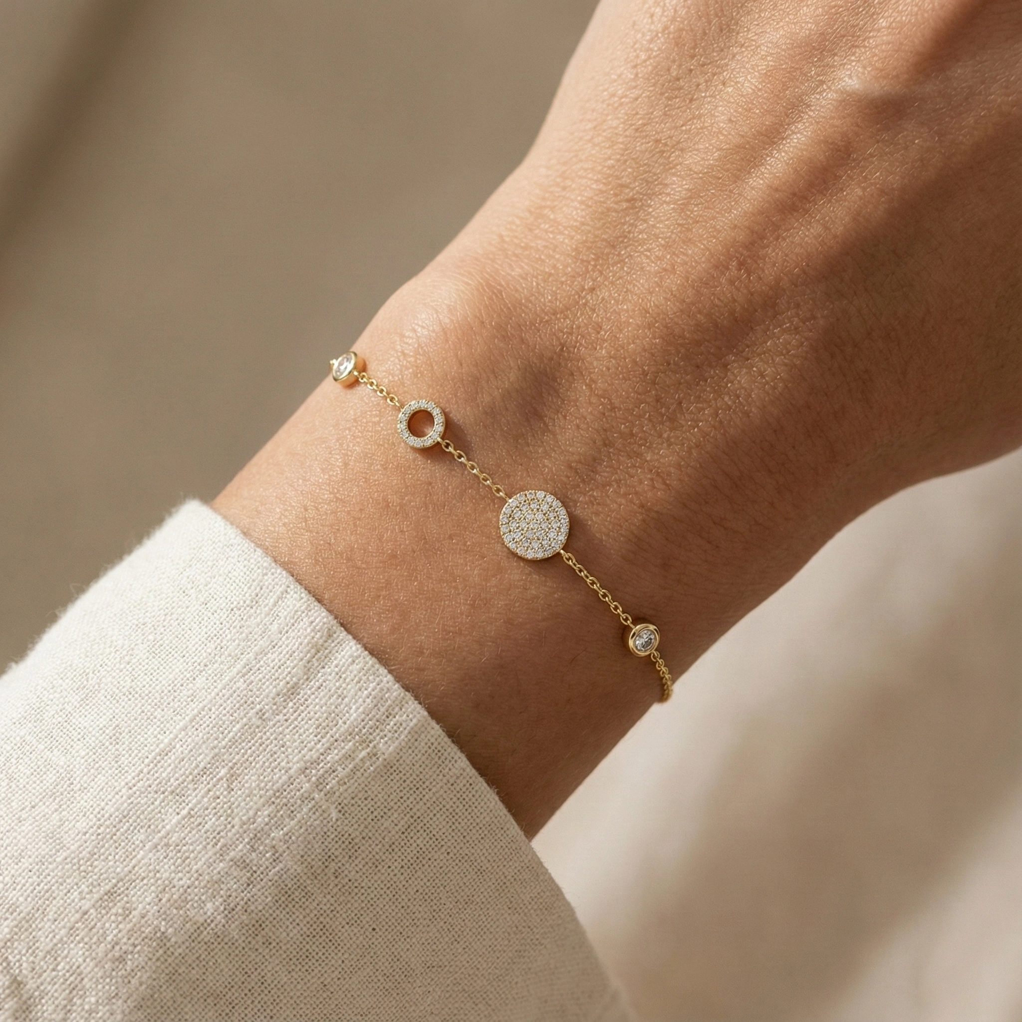Özenle yerleştirilmiş taşlar, reflektif yüzeyleriyle ışığı yakalayarak bilek çevresinde sofistike bir parıltı sunar. Minimal ve modern tasarım detayı, bileğe zarif bir görünüm kazandırır ve farklı takılarla kolayca kombinlenebilir. İnce ve ergonomik yapısıyla gün boyu konfor sağlar.
