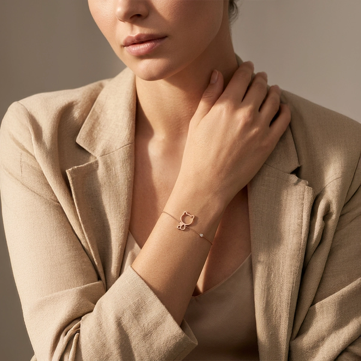 Kedi figürü, bağımsızlık, zarafet ve sadakatin sembolü olarak öne çıkar. Pırlanta taşla zenginleştirilen bu özel tasarım, ışığı dengeli ve dikkat çekici bir şekilde yansıtarak bilekliğe modern bir ışıltı kazandırır. İnce zincir yapısı sayesinde hafif ve konforlu bir kullanım sunar, farklı takılarla kolayca kombinlenebilir.
