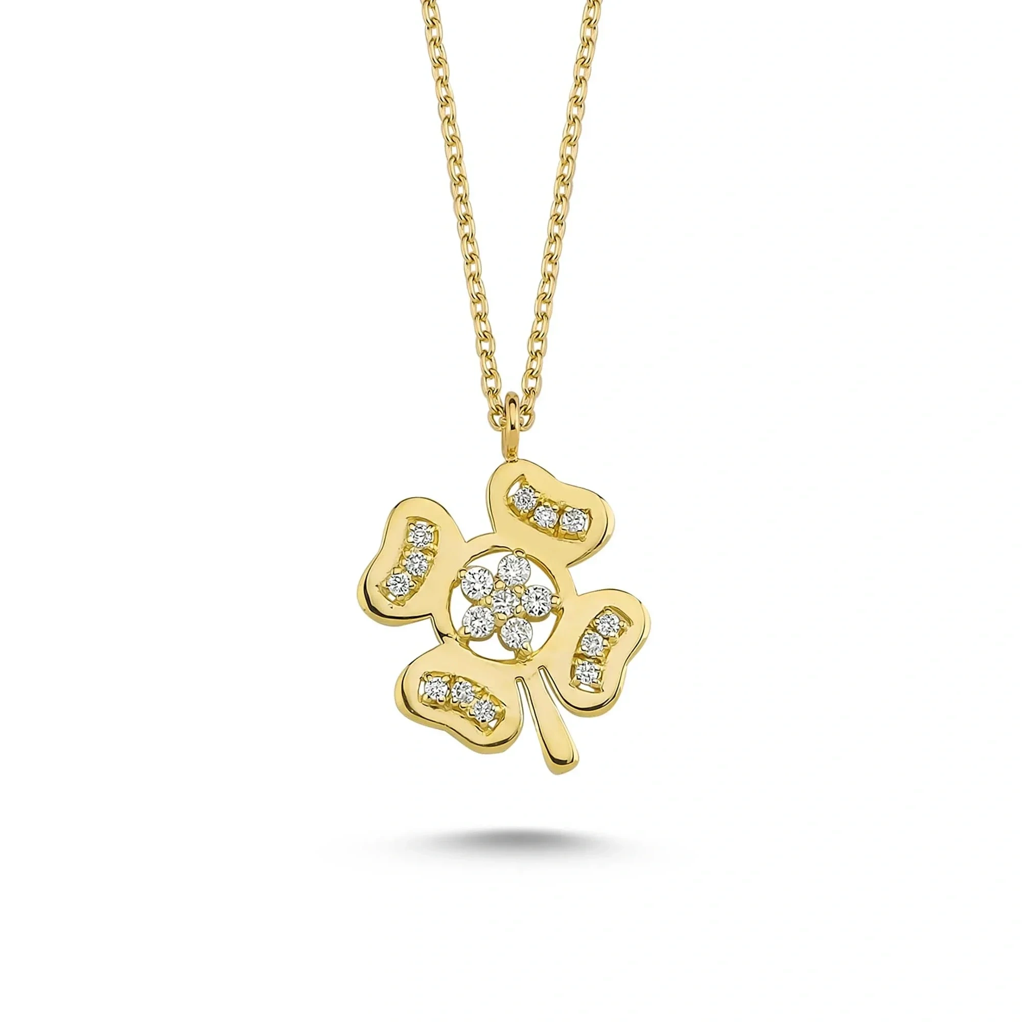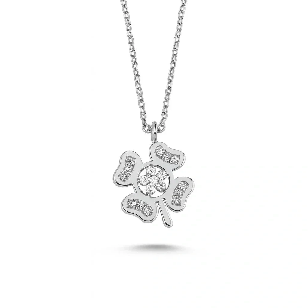 Yonca motifinin merkezinde ve yapraklarında konumlanan taşlar, ışığın geliş açısına göre farklı parlaklıklar yansıtarak kolyeye canlı ve etkileyici bir ışıltı kazandırır. Klasik sembolizmi çağdaş işçilikle birleştiren bu tasarım; tek başına minimal şıklık sunarken, farklı kolyelerle katmanlı kombinlerde de uyumlu bir tamamlayıcı olur. Günlük kullanımda sade bir zarafet isteyenler için ideal, özel günlerde ise stilinizi öne çıkaran zamansız bir parçadır.