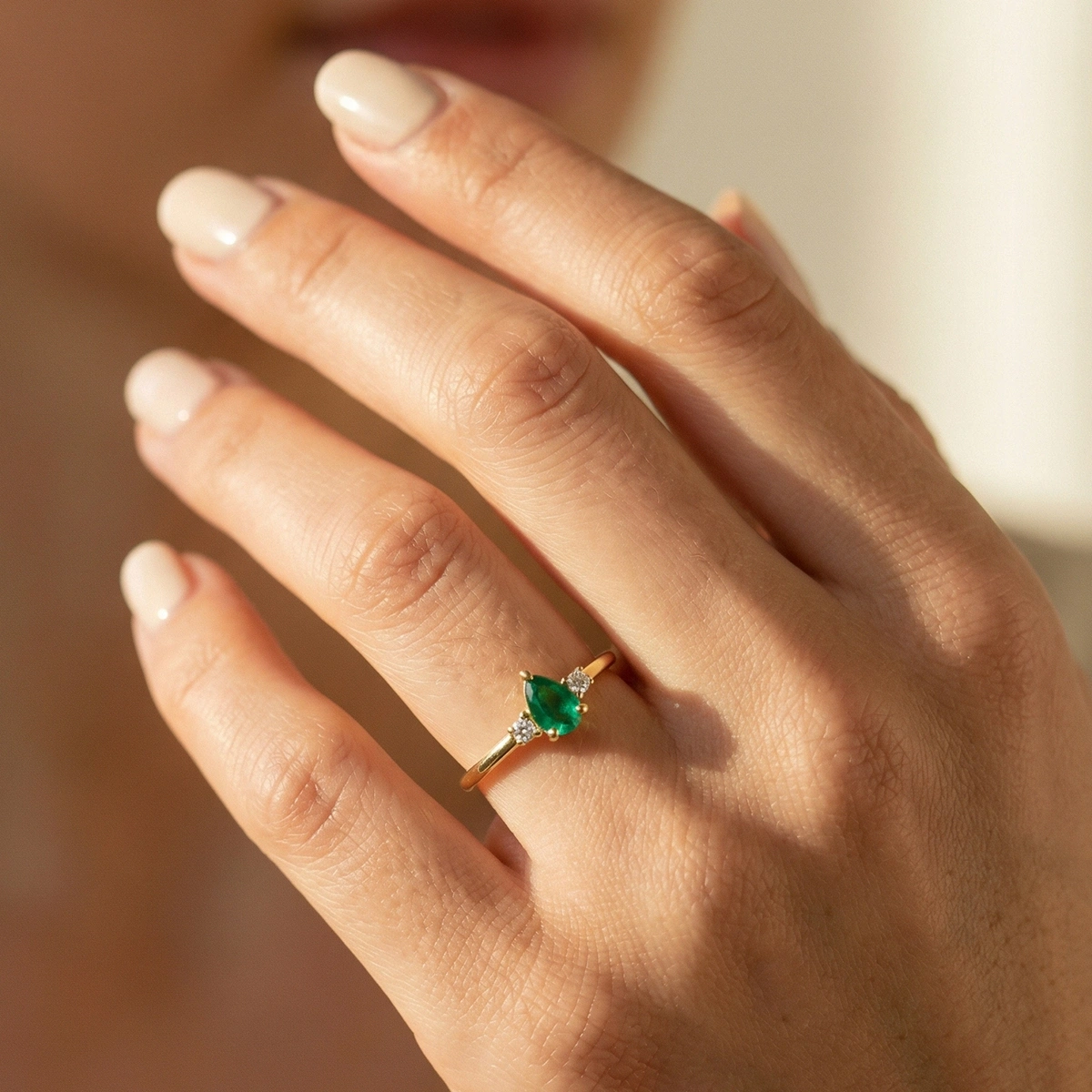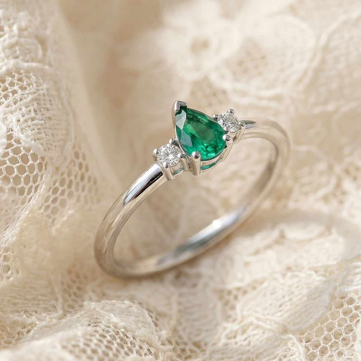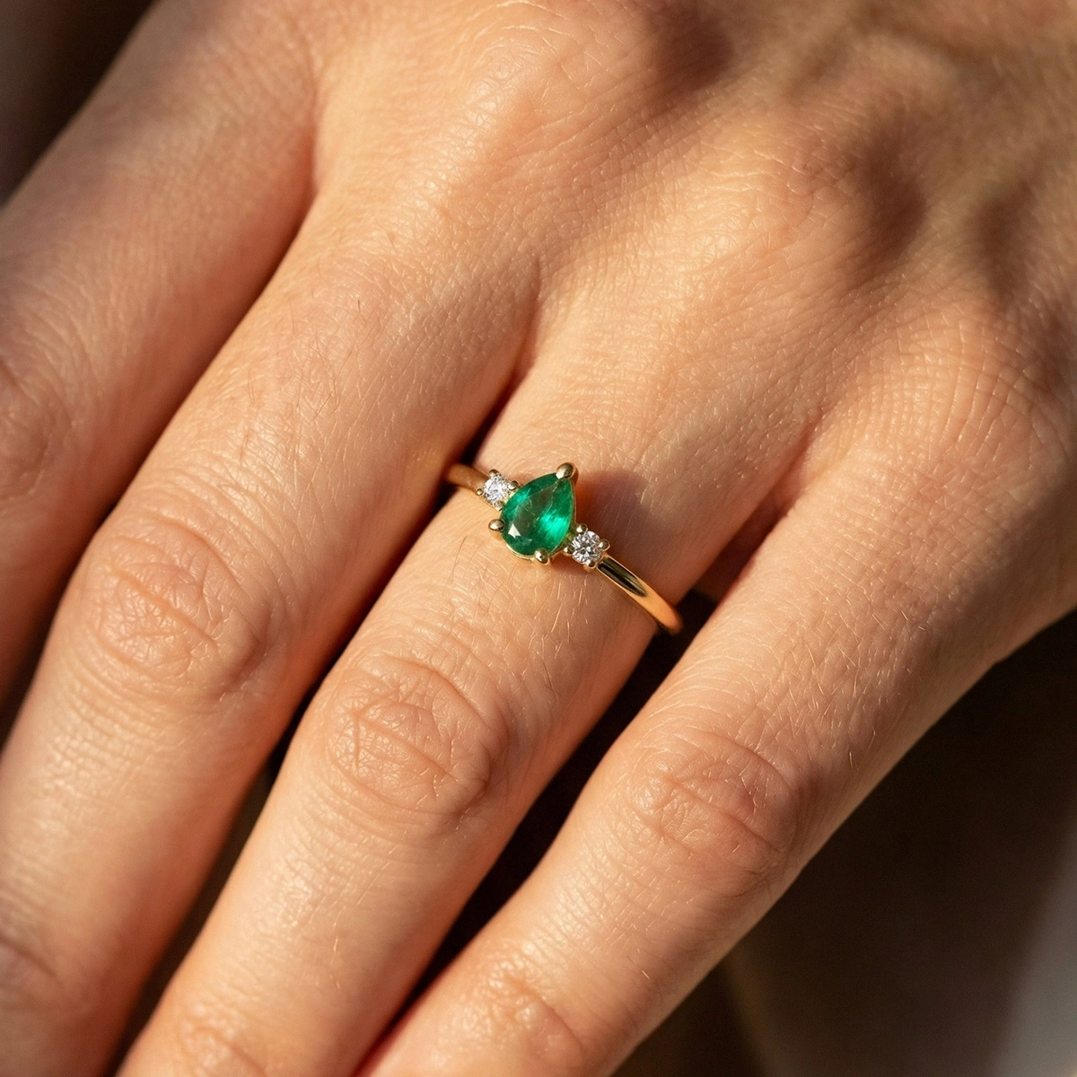 Minimal Zümrüt Yeşili Damla Taşlı Pırlanta Yüzük