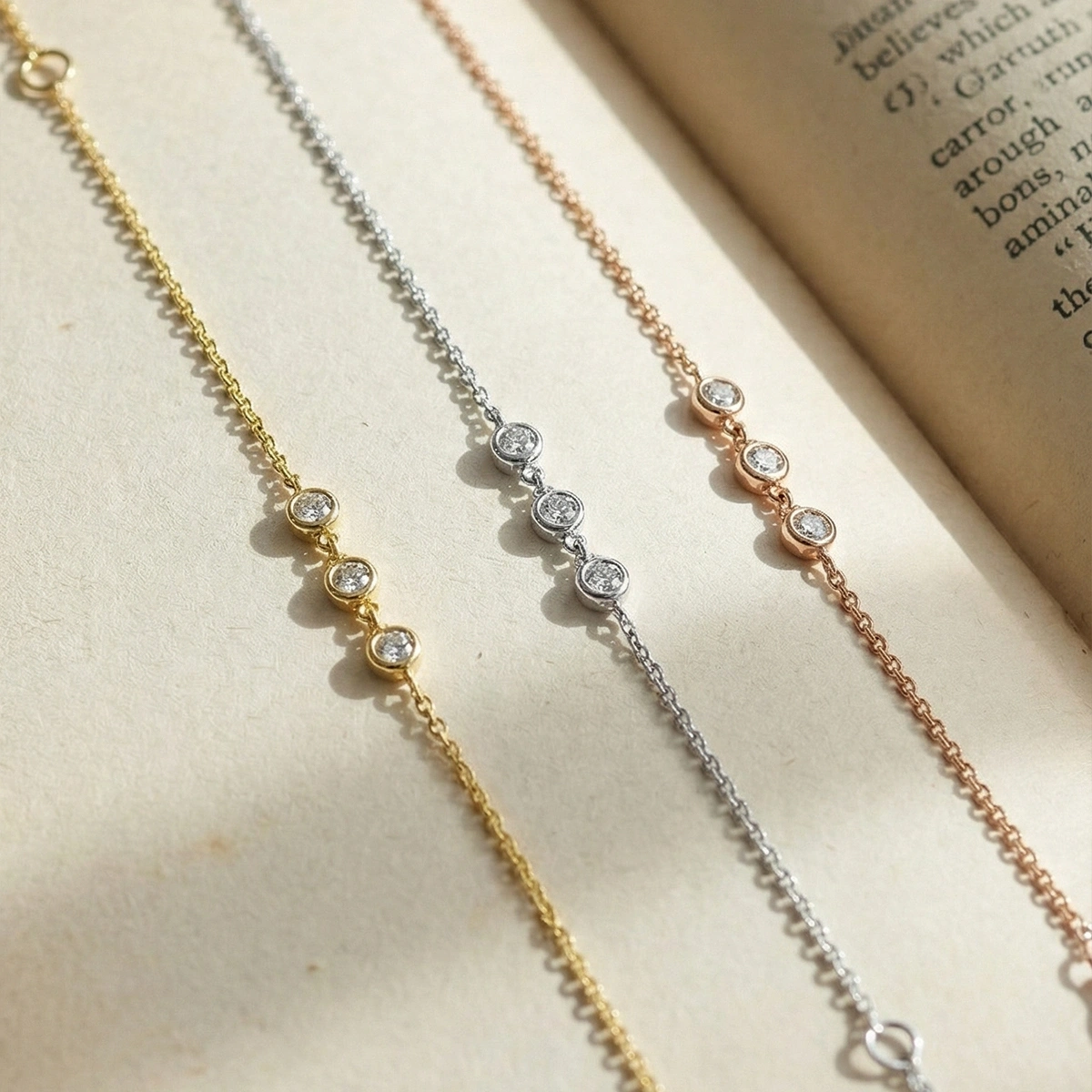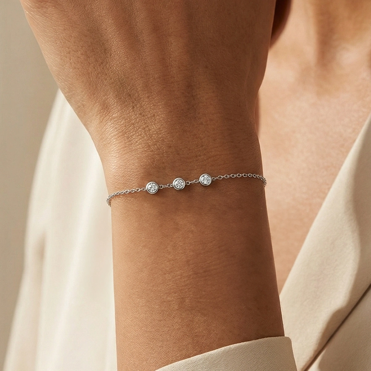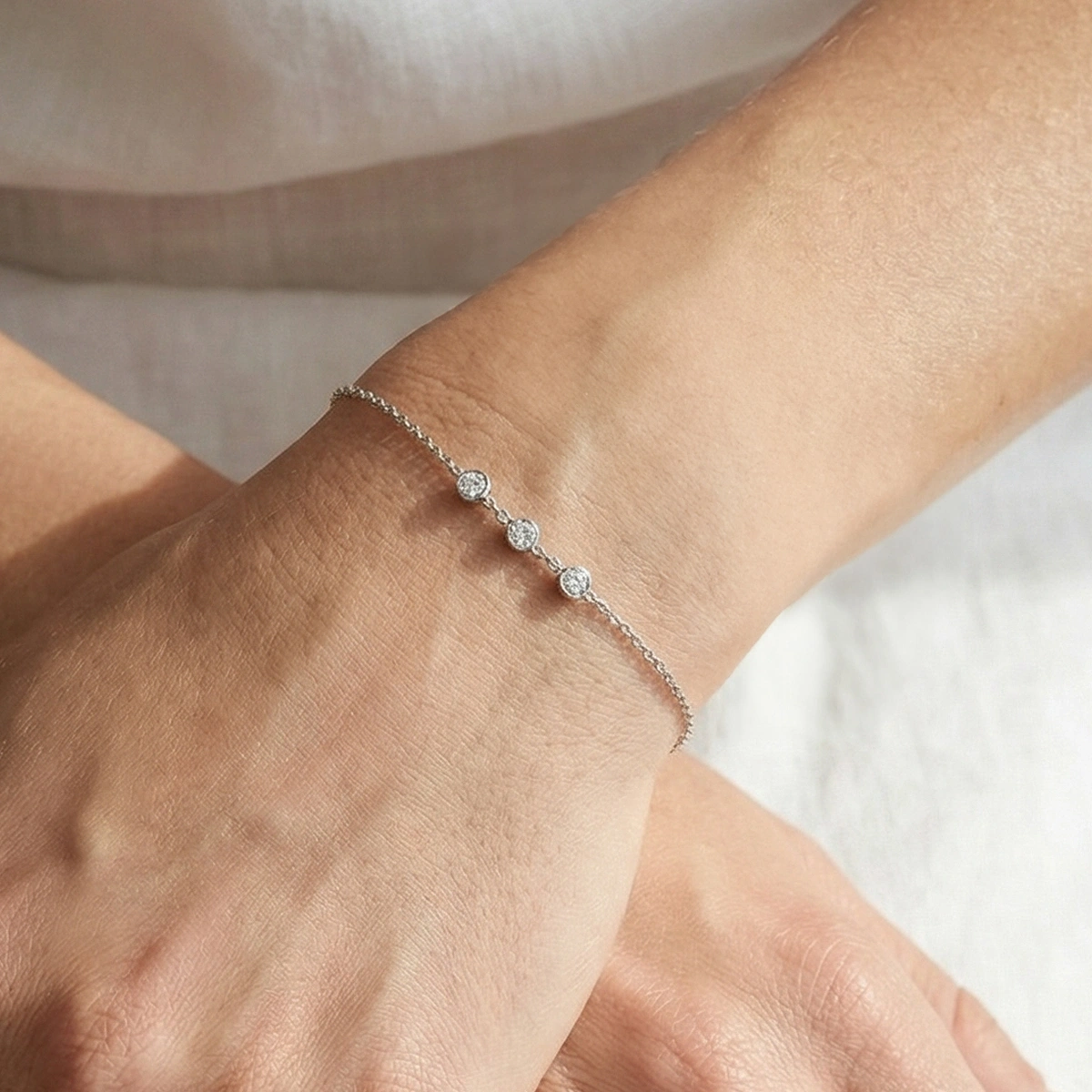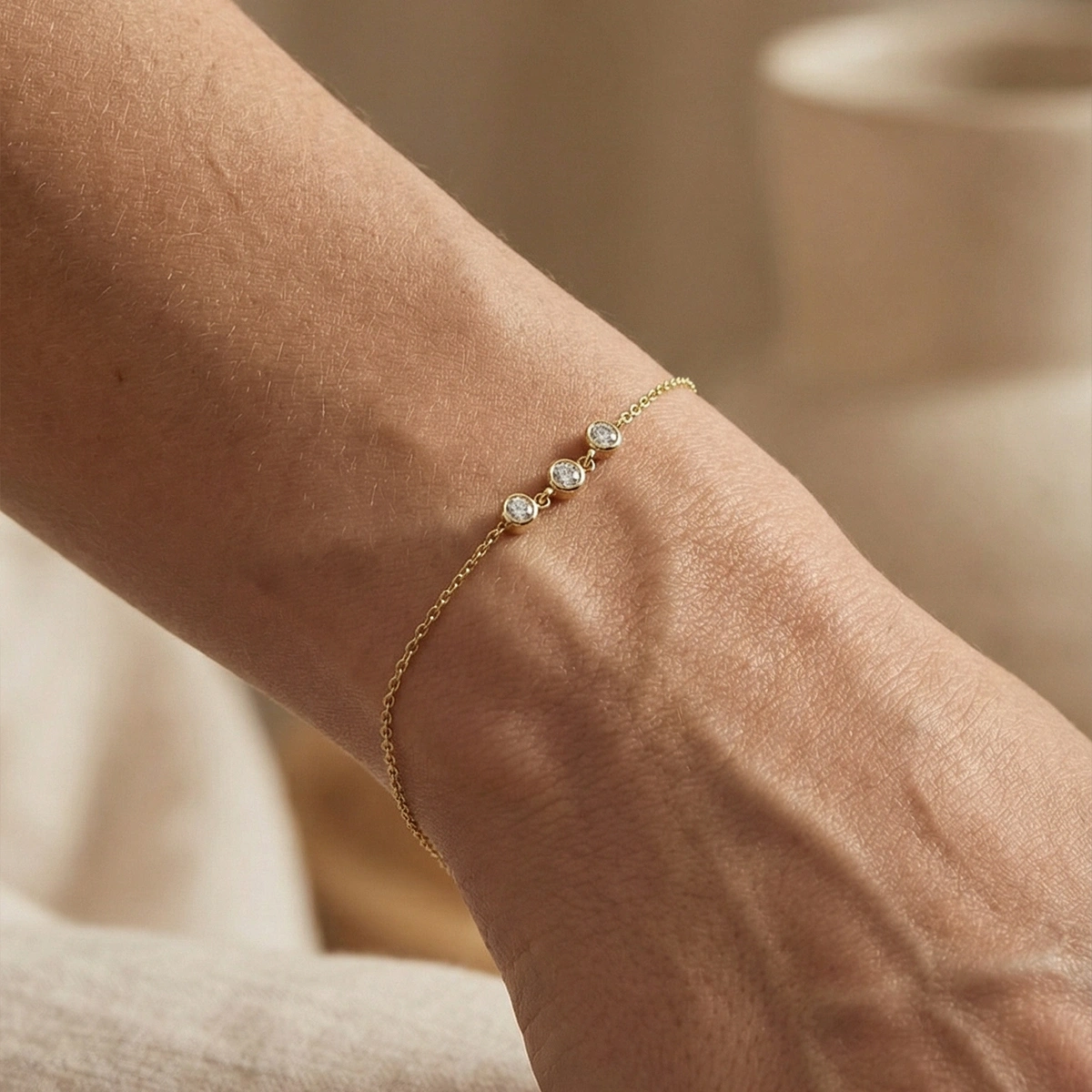 Parlak üç taş detayı, bileğinizde göz alıcı bir ışıltı yaratarak sade ama güçlü bir duruş sunar. Diğer takılarla kolayca kombinlenebilen yapısı sayesinde farklı tarz ve zevklere hitap eder. Kaliteli işçilikle üretilmiş bu bileklik, uzun süreli kullanıma uygundur ve her anınıza estetik bir dokunuş ekler.